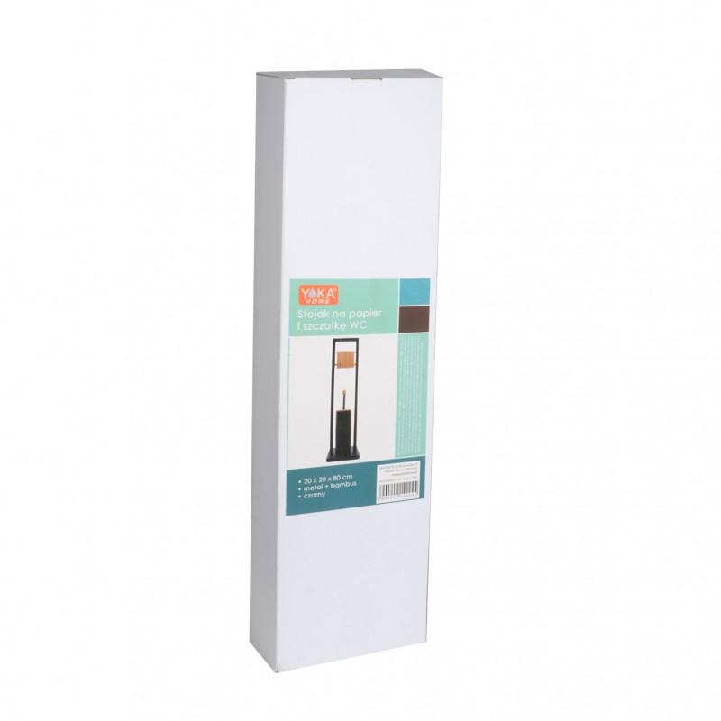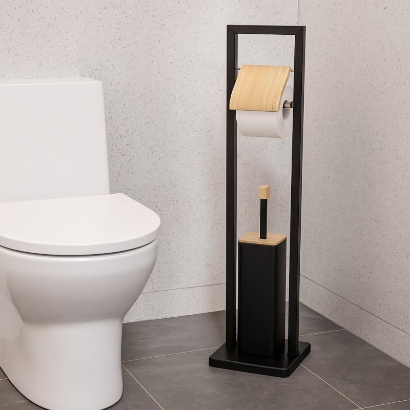 Praktyczny stojak do WC 2w1 ze szczotką toaletową oraz uchwytem na papier toaletowy z klapką. Stojak wykonany został z wysokiej jakości stali malowanej na kolor czarny. Osłona papieru oraz szczotka WC ozdobione zostały elementami wykonanym z naturalnego drewna bambusowego odpornego na wilgoć. Stojak posiada solidną podstawę o kwadratowym kształcie, zapewniająca stabilność. Szczotka posiada zabezpieczający plastikowy pojemnik chroniący przed rdzewieniem i ułatwiający czyszczenie. Lekki stelaż umożliwia łatwe przenoszenie stojaka w dogodne miejsce. Antypoślizgowa podstawa zapewnia stojakowi dużą stabilność.