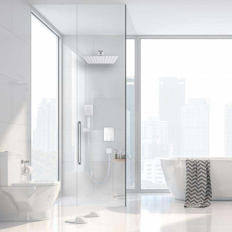 Nowoczesny zestaw prysznicowy podtynkowy z deszczownicą oraz słuchawką prysznicową. Zawiera baterię mechaniczną podtynkową z mieszaczem wody oraz mechanicznym przełącznikiem strumienia wody deszczownica / słuchawka . W zestawie znajduje się podtynkowy box przyłączeniowy do wody umożliwiający precyzyjny montaż panelu zewnętrznego na płytkach ceramicznych. Design zestawu został podporządkowany najnowszym trendom - prezentuje się niezwykle elegancko i idealnie pasuje do nowocześnie urządzonej łazienki.