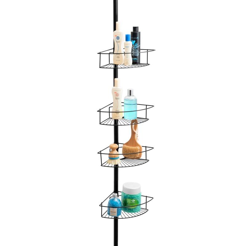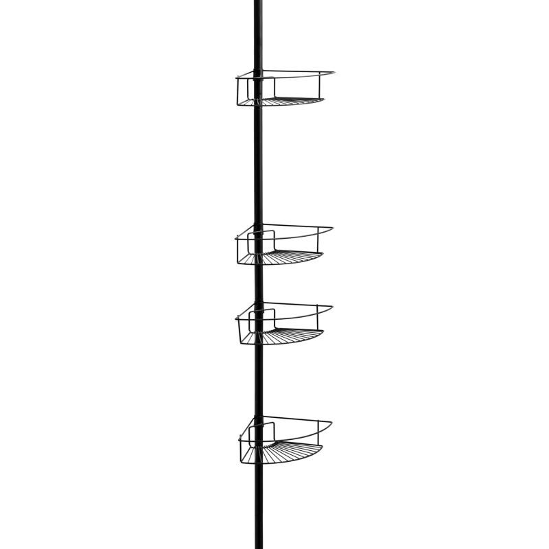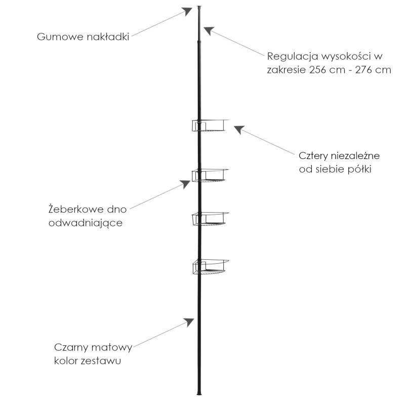 Teleskopowa narożna półka łazienkowa. Do zamontowania w kabinie prysznicowej bądź w rogu łazienki. Wykonana ze stali malowanej proszkowo na kolor czarny (mat). Oferuje dużo miejsca na przybory łazienkowe. Posiada 4 narożne koszyko-półki.