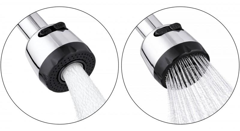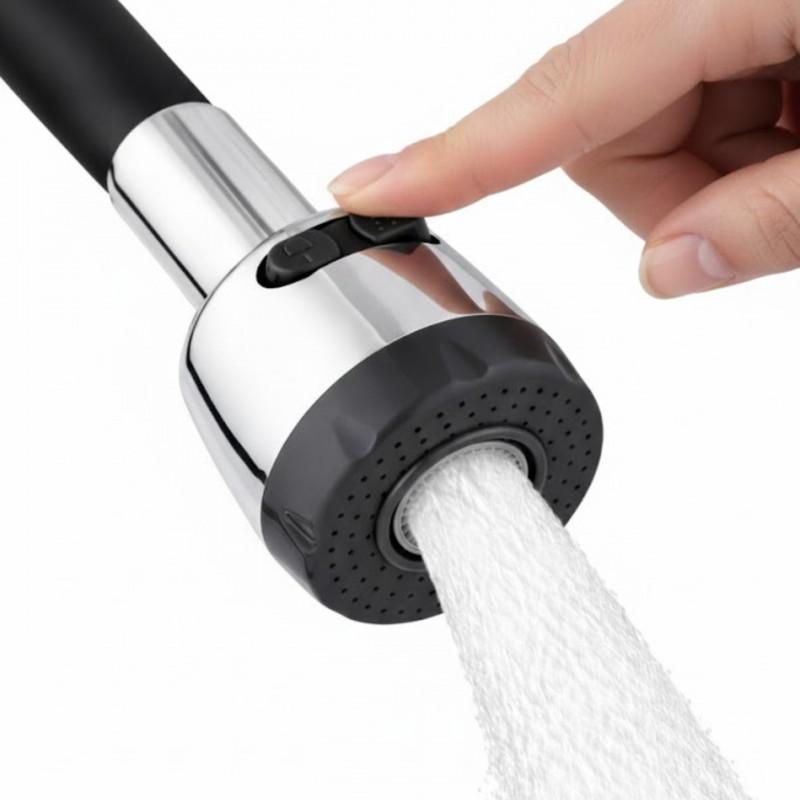 Długa, elastyczna wylewka z pamięcią kształtu w kolorze czarnym. Wyposażona jest w dwustrumieniową końcówkę, zapewniającą dogodne ustawienie strumienia wody w zależności od potrzeb.