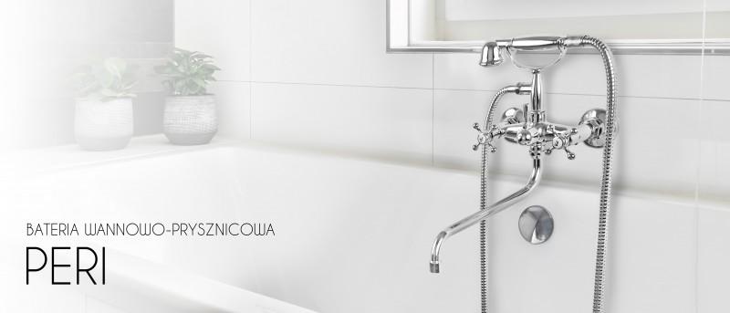 Bateria wannowo-prysznicowa, ścienna ze stałą wylewką oraz słuchawką prysznicową. Atutem baterii są dwa uchwyty w stylu retro z charakterystycznymi napisami "HOT" i " COLD”.