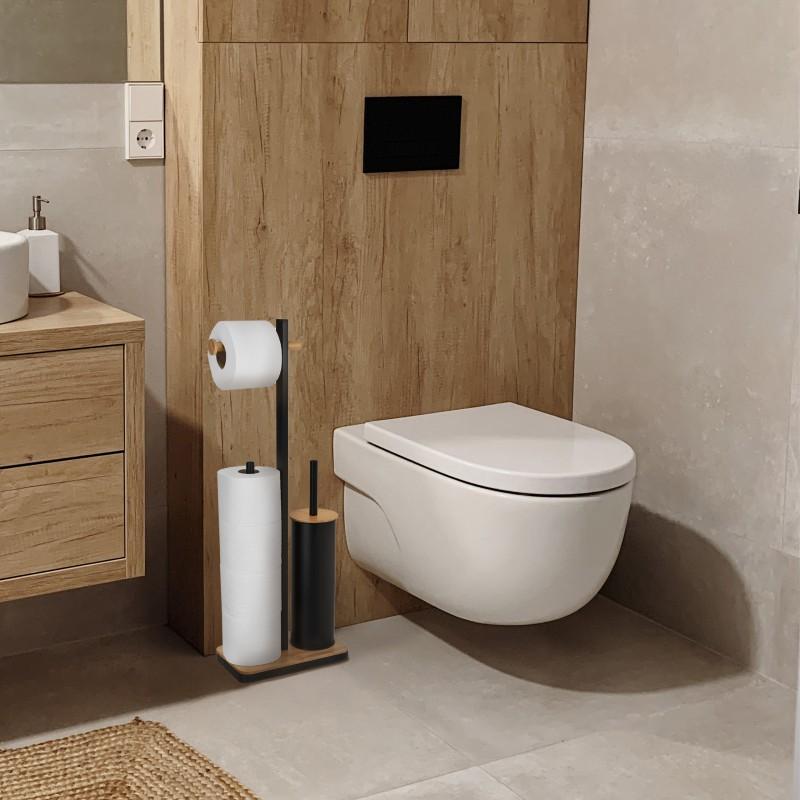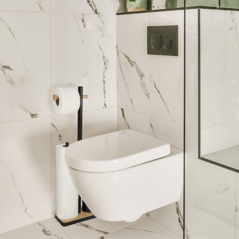 Elegancki stojak na zapasowy papier toaletowy wraz ze szczotką WC oraz z uchwytem na dodatkową rolkę.