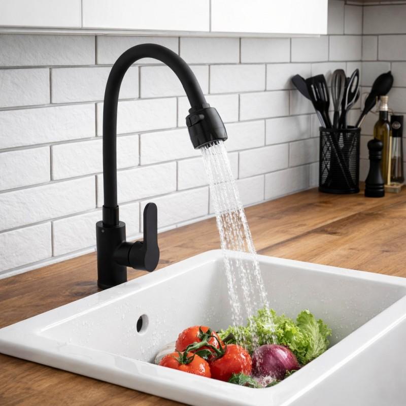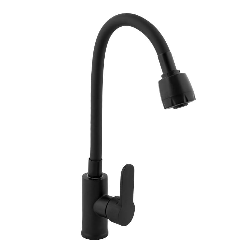 Mechaniczna bateria zlewozmywakowa, stojąca, jednouchwytowa. Posiada długą, ruchomą, elastyczną, silikonową wylewkę w czarnym kolorze.
