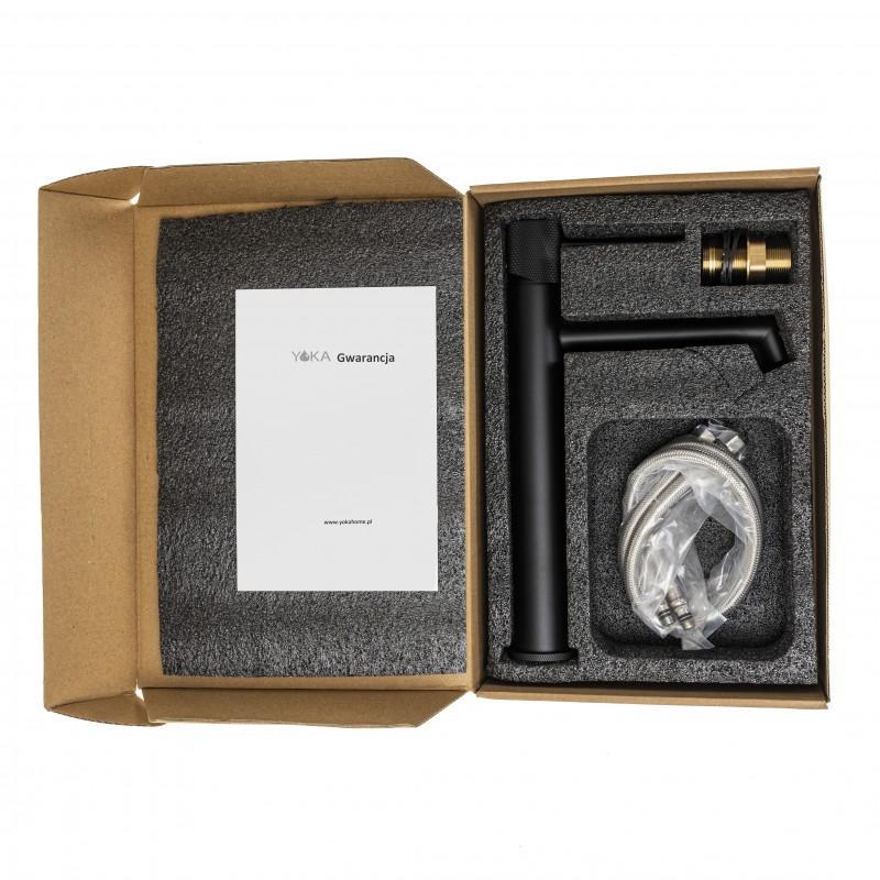 Korpus baterii wykonano ze stali nierdzewnej. Zestaw zawiera 2 wysokiej jakości wężyki w oplocie ze stali nierdzewnej o długości 50 cm ze standardowym przyłączem 3/8 cala oraz komplet akcesoriów do montażu baterii.