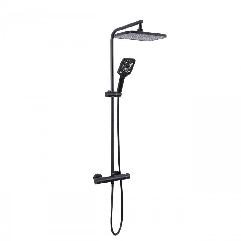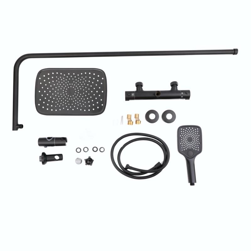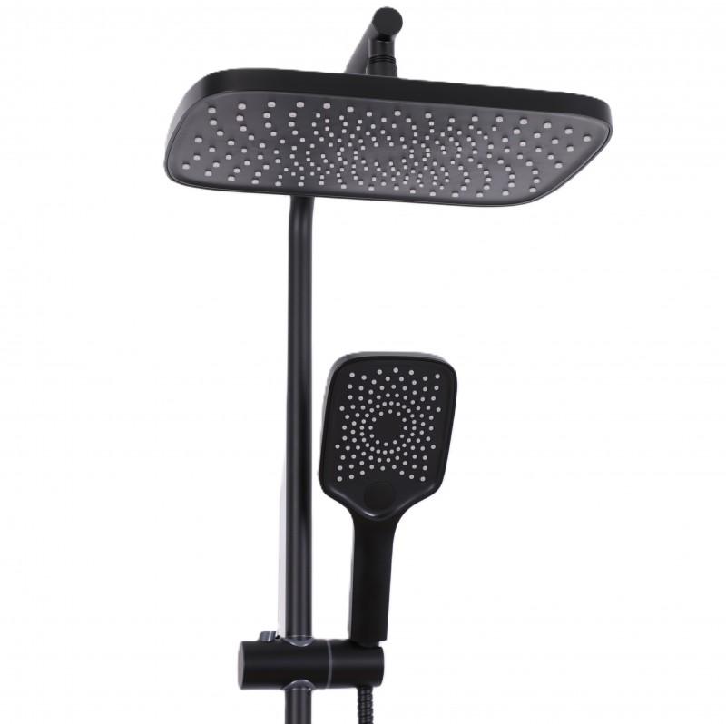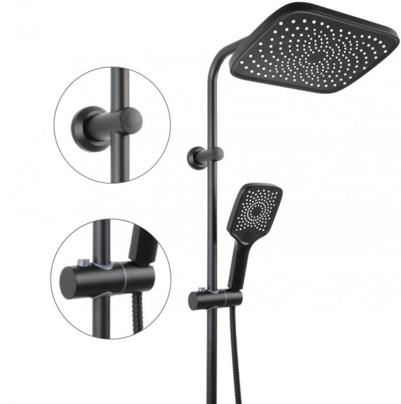 Zestaw zawiera wysokiej klasy baterię prysznicową z regulacją przepływu i mieszaczem temperatury wody a także kolumnę prysznicową wraz z ładną deszczownicą oraz przełącznikiem strumienia między nią, a słuchawką.