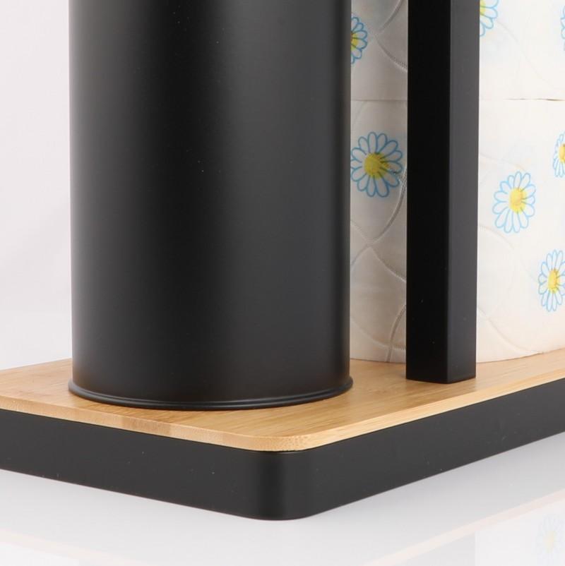 Stojak wykonany z wysokich jakości stali - malowany proszkowo w kolorze czarnym oraz wykończony elementami z naturalnego drewna – bambusa.
