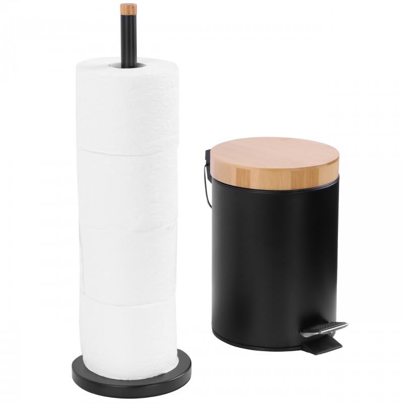 Praktyczny i stylowy stojak na zapasowy papier toaletowy, który pomieści do 4 rolek. Wykonany z wysokiej jakości stali pokrytej czarną matową farbą, z drewnianym akcentem na górze. Podstawa wyposażona w podkładkę zapobiegającą ślizganiu się i rysowaniu podłogi. Idealny do łazienek w stylu nowoczesnym, klasycznym lub surowym.