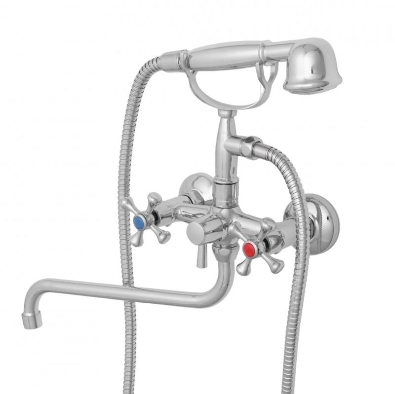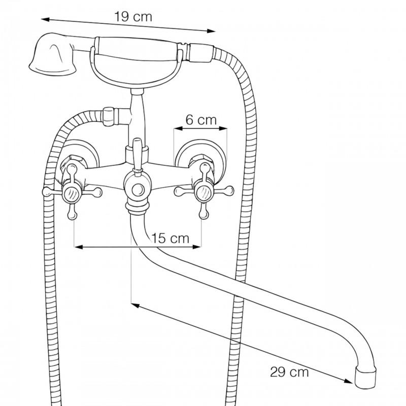 Bateria wannowo-prysznicowa ścienna ze stałą wylewką wannową oraz zestawem prysznicowym (ręczną słuchawką) to idealne rozwiązanie dla osób poszukujących połączenia klasycznego wzornictwa z nowoczesną funkcjonalnością. Model ten wyróżnia się designem retro – posiada dwa osobne uchwyty mieszające ciepłą i zimną wodę, stylizowane na dawny styl. Takie klasyczne elementy dodają łazience wyjątkowego charakteru i atmosfery nostalgii, podkreślając unikalny urok minionych lat. Jednocześnie bateria została wykończona elegancką powłoką chromowaną o wysokim połysku, która nie tylko efektownie się prezentuje, ale także zapewnia ochronę przed korozją, ścieraniem i uszkodzeniami mechanicznymi. Mimo klasycznego wyglądu, wewnątrz zastosowano nowoczesne rozwiązania – ceramiczne głowice gwarantują solidność, pełną szczelność oraz wieloletnią niezawodność baterii, dając pewność trwałości na lata intensywnego użytkowania.