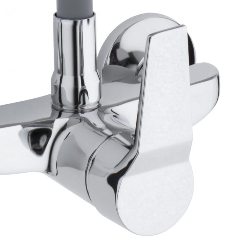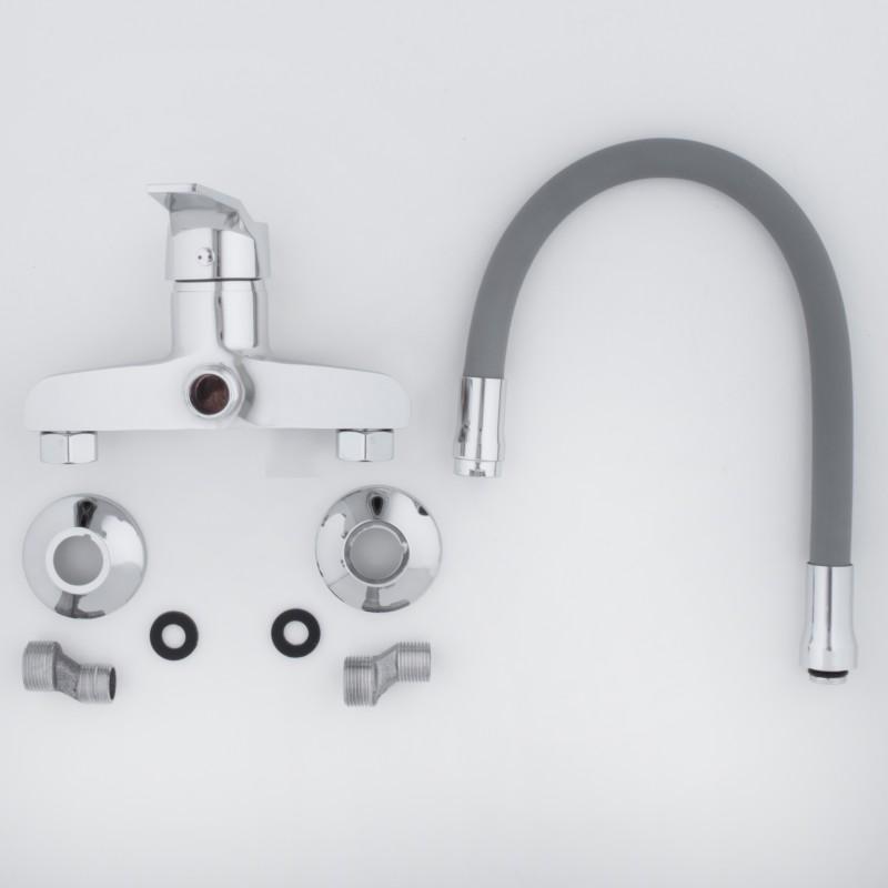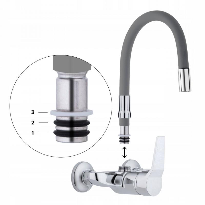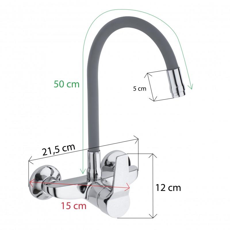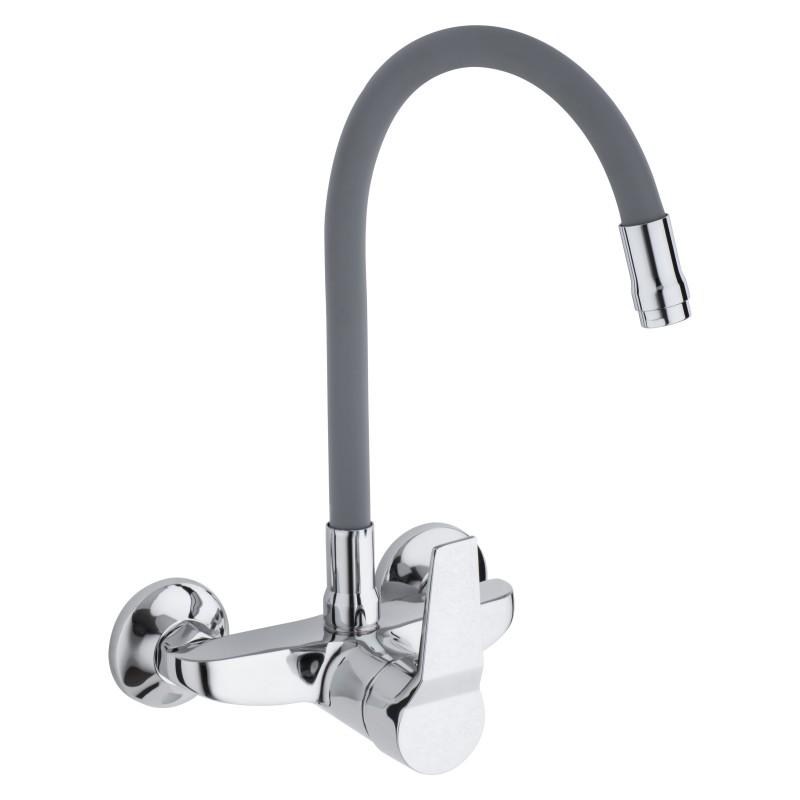 Mechaniczna bateria zlewozmywakowa, ścienna, jednouchwytowa. Jest to bardzo praktyczne rozwiązanie do każdej kuchni. Posiada długą, ruchomą, elastyczną wylewkę z pamięcią kształtu w kolorze szarym, która daje możliwość nie tylko szybkiego opłukiwania naczyń czy umycia zlewu, ale również wygodnego napełnianie garnków wodą.