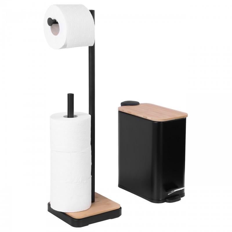 Praktyczny i stylowy stojak na papier toaletowy, który nie tylko zapewnia wygodny dostęp do papieru, ale również posiada dodatkowy uchwyt na zapasową rolkę. Wykonany z trwałych materiałów z eleganckim bambusowym wykończeniem, doskonale komponuje się z koszem, tworząc spójną całość.