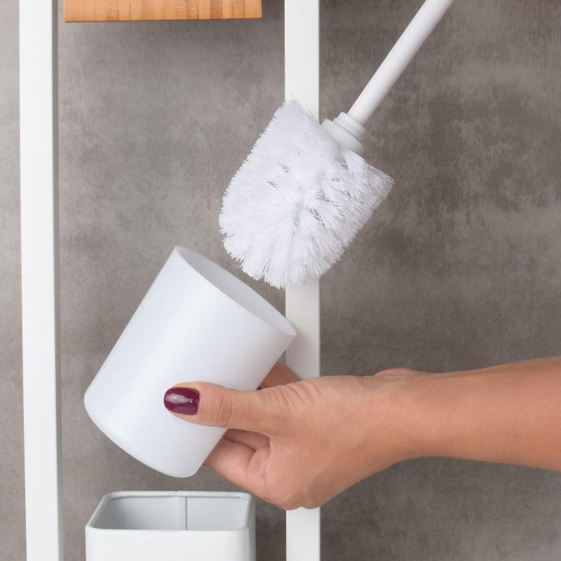 W zestawie znajduje się szczotka do WC, której włosie utrzymane jest w eleganckim białym kolorze. Dodatkowy pojemnik wewnątrz zbiera ociekającą wodę, zapobiegając rozlewaniu się po podłodze i utrzymując łazienkę w czystości.