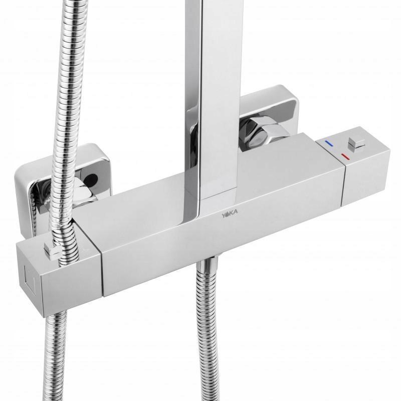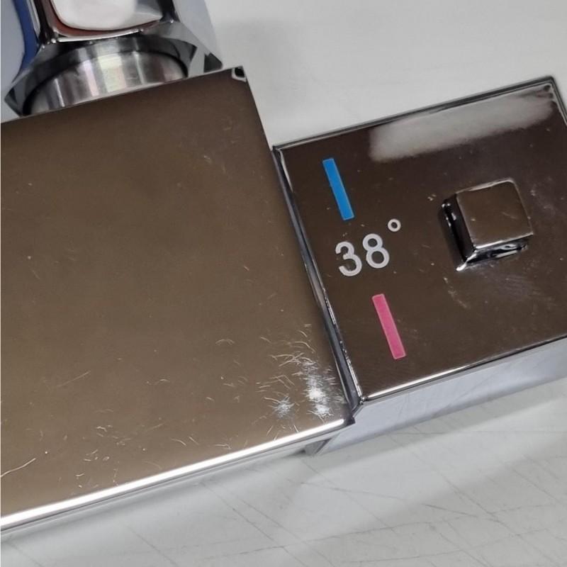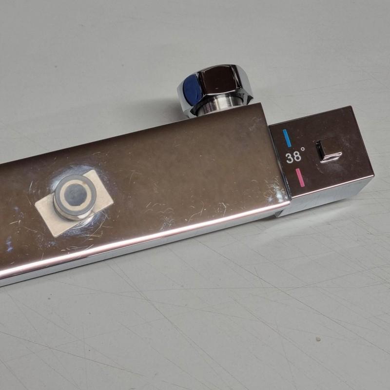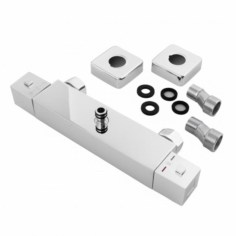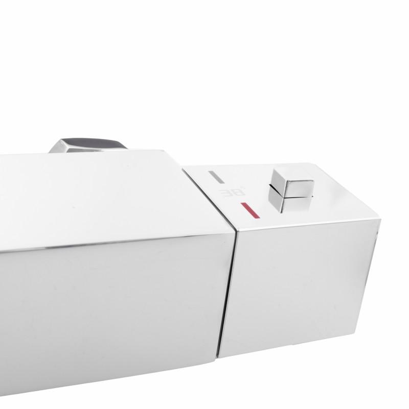 Termostatyczna naścienna bateria prysznicowa z opcją blokady gorącej wody przy 38°C. Wykonana jest z wysokiej jakości mosiądzu pokrytego chromem. Jej ceramiczna głowica (35 mm) gwarantuje trwałość i wytrzymałość. W zestawie znajdują się wszystkie elementy potrzebne do montażu.