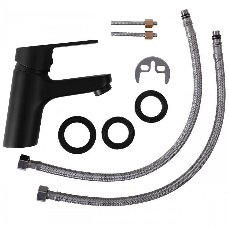 ✦ bateria umywalkowa z perlatorem napowietrzającym strumień wody, 2 wysokiej jakości wężyki w oplocie ze stali nierdzewnej o długości 40 cm ze standardowym przyłączem 3/8 cala oraz komplet akcesoriów do montażu baterii;