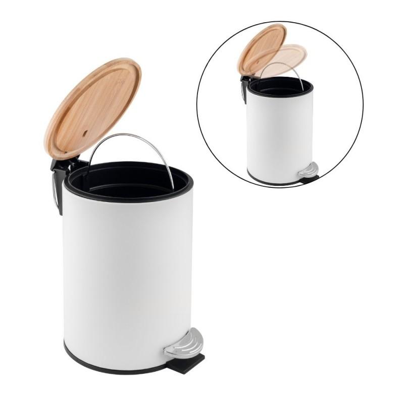 Nowoczesny kosz łazienkowy wykonany ze stali malowanej proszkowo na biało. Pokrywa zrobiona z drewna bambusowego. Pojemnik o idealnie gładkim, matowym wykończeniu. Podstawa całego produktu wykonana jest z tworzywa sztucznego, która zapobiega rysowaniu powierzchni podłogi. Z tyłu kosza znajduje się ruchomy, metalowy uchwyt do przenoszenia lub zawieszenia kosza. Kosz na śmieci idealnie nadaje się zarówno do łazienki jak i do kuchni, do segregacji np. bio odpadów.