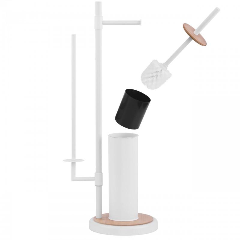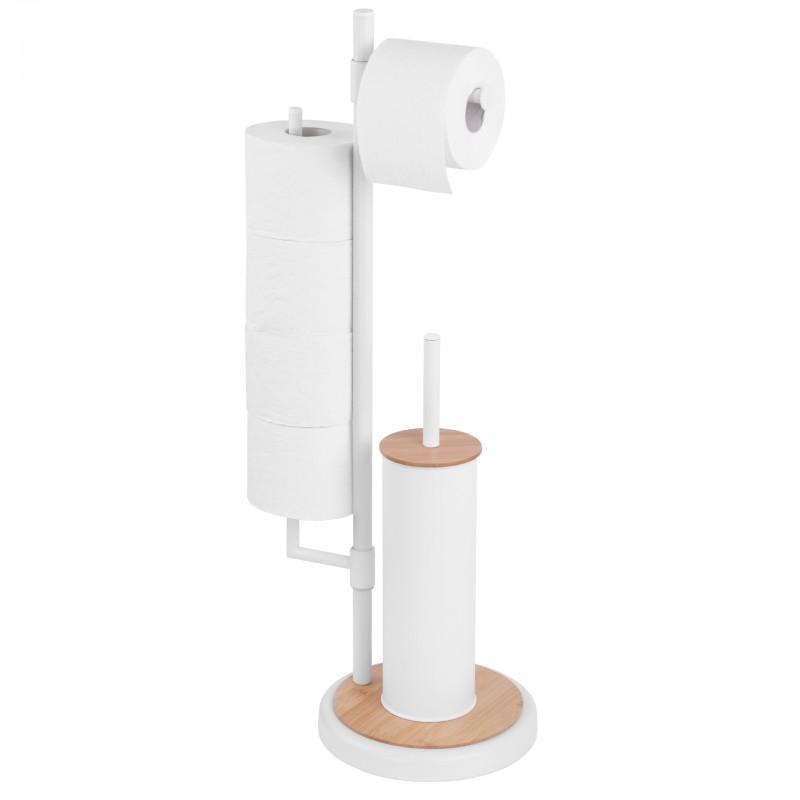 Elegancki stojak na zapasowy papier toaletowy wraz ze szczotką WC oraz z uchwytem na dodatkową rolkę. Stojak wykonany z wysokiej jakości stali malowanej proszkowo oraz elementami bambusa. Szeroka podstawa oraz podkładki z tworzywa sztucznego zapewniają doskonałą stabilność. Doskonałe wyposażenie każdej toalety. Idealnie sprawdzi się we wnętrzu urządzonym w stylu klasycznym, nowoczesnym lub skandynawskim.