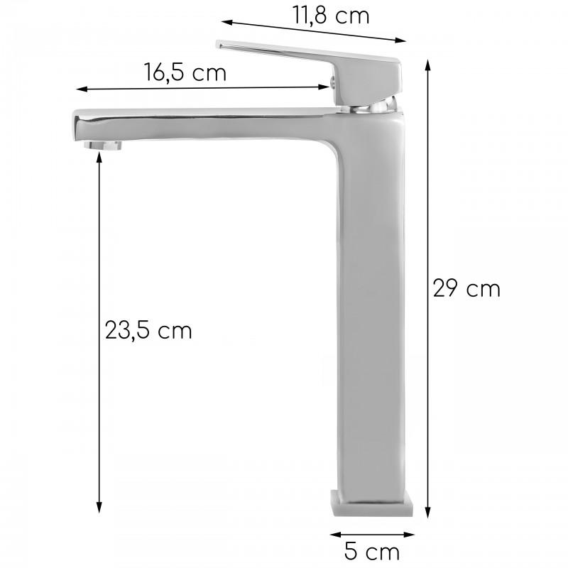 Wysoka mechaniczna bateria umywalkowa, wolnostojąca, jednouchwytowa ze stałą wylewką. Zarówno 35 mm głowica ceramiczna jak i perlator oszczędzają nawet do 40% wody. Zestaw zawiera 2 wysokiej jakości wężyki w oplocie ze stali nierdzewnej o długości 40 cm ze standardowym przyłączem 3/8 cala oraz komplet akcesoriów do montażu baterii.
