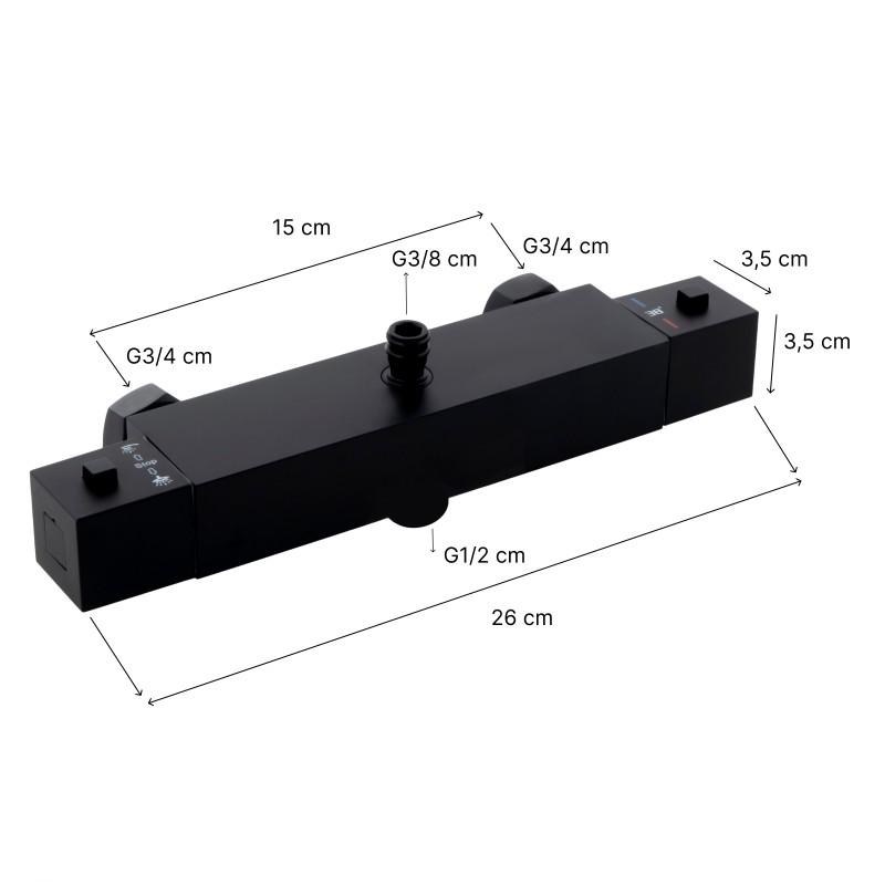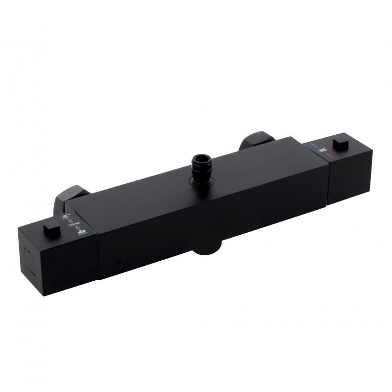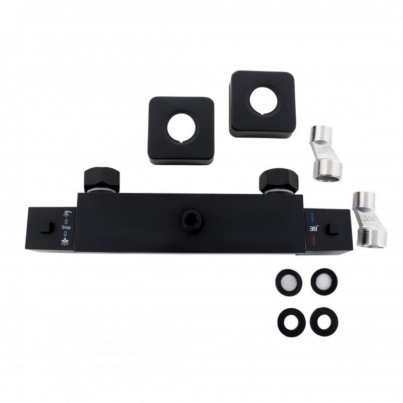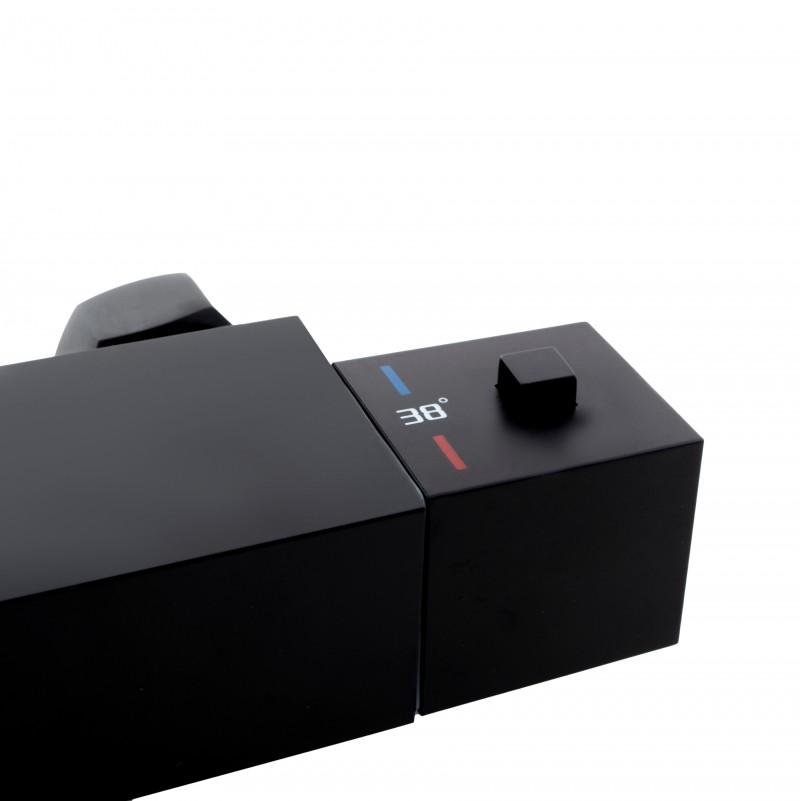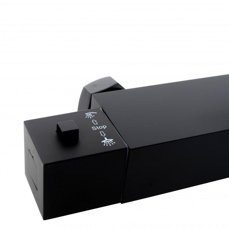 Termostatyczna naścienna bateria prysznicowa w kolorze czarnym. Wykonana jest z wysokiej jakości mosiądzu. Bateria z funkcją precyzyjnego ustawiania temperatury gwarantuje wysoki komfort oraz bezpieczeństwo użytkowania natrysku. Posiada blokadę gorącej wody przy 38°C. W zestawie znajdują się wszystkie elementy potrzebne do montażu