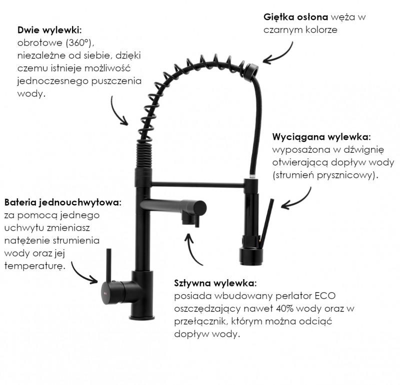 który usprawnia codzienne użytkowanie nawet przy dużym, dwukomorowym zlewozmywaku. Obydwie wylewki mają możliwość obrotu o 360°.