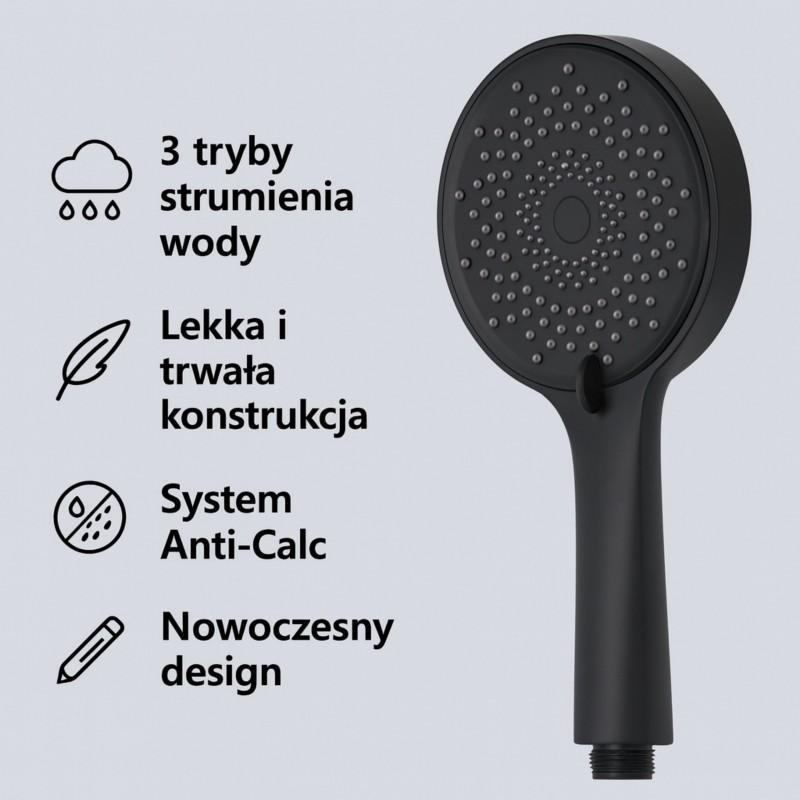 Stylowa i praktyczna czarna matowa słuchawka prysznicowa 3-funkcyjna to idealne rozwiązanie dla osób, które cenią komfort, nowoczesny design oraz trwałość. Wyposażona w trzy tryby natrysku – deszczowy, punktowy i mieszany – pozwala dopasować rodzaj strumienia do indywidualnych potrzeb: od relaksującej kąpieli po intensywny masaż wodny.