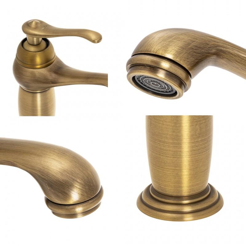 Mechaniczna bateria umywalkowa, stojąca, jednouchwytowa ze stałą wylewką. Bateria wykonana w stylu retro/vintage w kolorze złotym. Głowica ceramiczna 35 mm. Korpus baterii wykonano z mosiądzu.