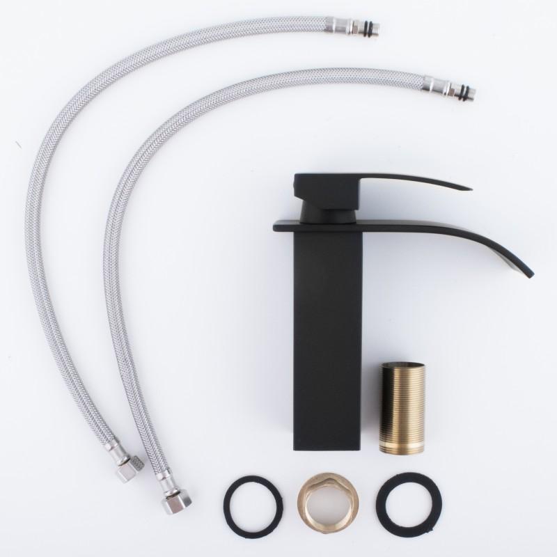Mechaniczna bateria umywalkowa, stojąca, jednouchwytowa ze stałą wylewką z efektem wodospadu i ceramiczną wymienną głowicą 25 mm. Korpus baterii wykonano z mosiądzu. Zestaw zawiera 2 wysokiej jakości wężyki w oplocie ze stali nierdzewnej o długości 50 cm ze standardowym przyłączem 3/8 cala oraz komplet akcesoriów do montażu baterii. Design baterii został podporządkowany najnowszym trendom - prezentuje się niezwykle elegancko i idealnie pasuje do nowocześnie urządzonej łazienki.
