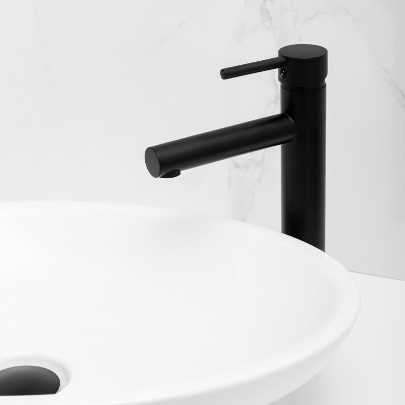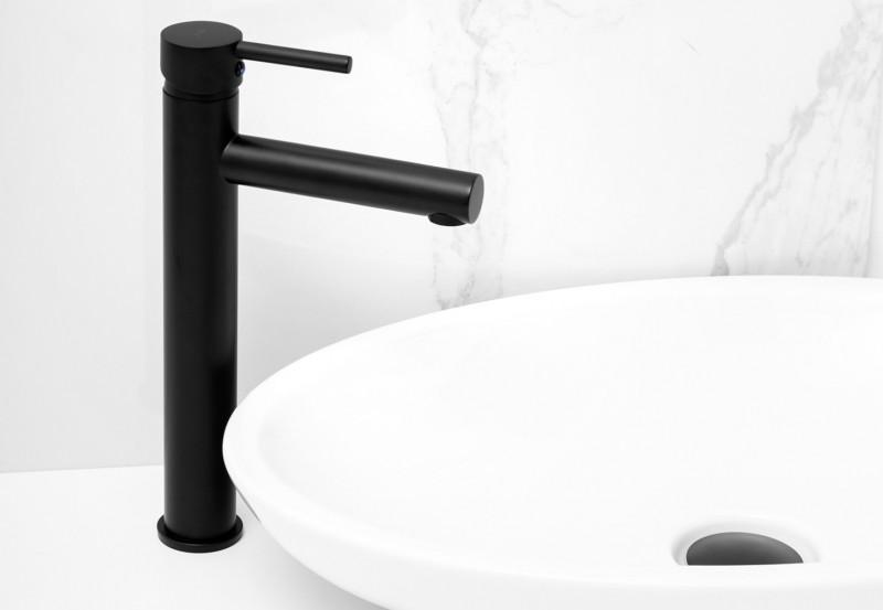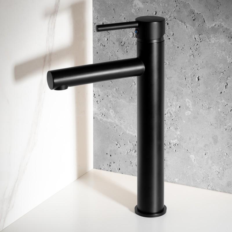 Wysoka bateria umywalkowa, stojąca, jednouchwytowa ze stałą wylewką w kolorze czarnym. Doskonałą jakość czarnej powierzchni gwarantuje nowoczesna technologia malowania proszkowego. Ceramiczna głowica zapewnia wieloletnią trwałość i wytrzymałość.